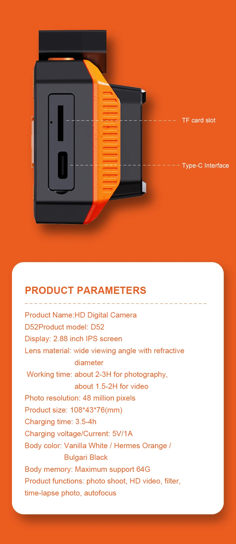 D52 4K Kids Digital Camera, K P, 48MP, 18x Zoom, IPS Screen, Outdoor Shooting, Selfie, Video, New
